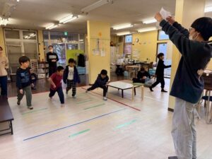 職員が色のついたカードを示し、言葉の指示を関連付けて、「青→歩く」「赤→止まる」「黄色→後ろに1歩下がる」とゲームを始める前にルールをお伝えします。ゲームでは、そのカードが出た時はどうする?を子ども達に考えてもらい、「処理する能力」や「感情のコントロール」を養います!